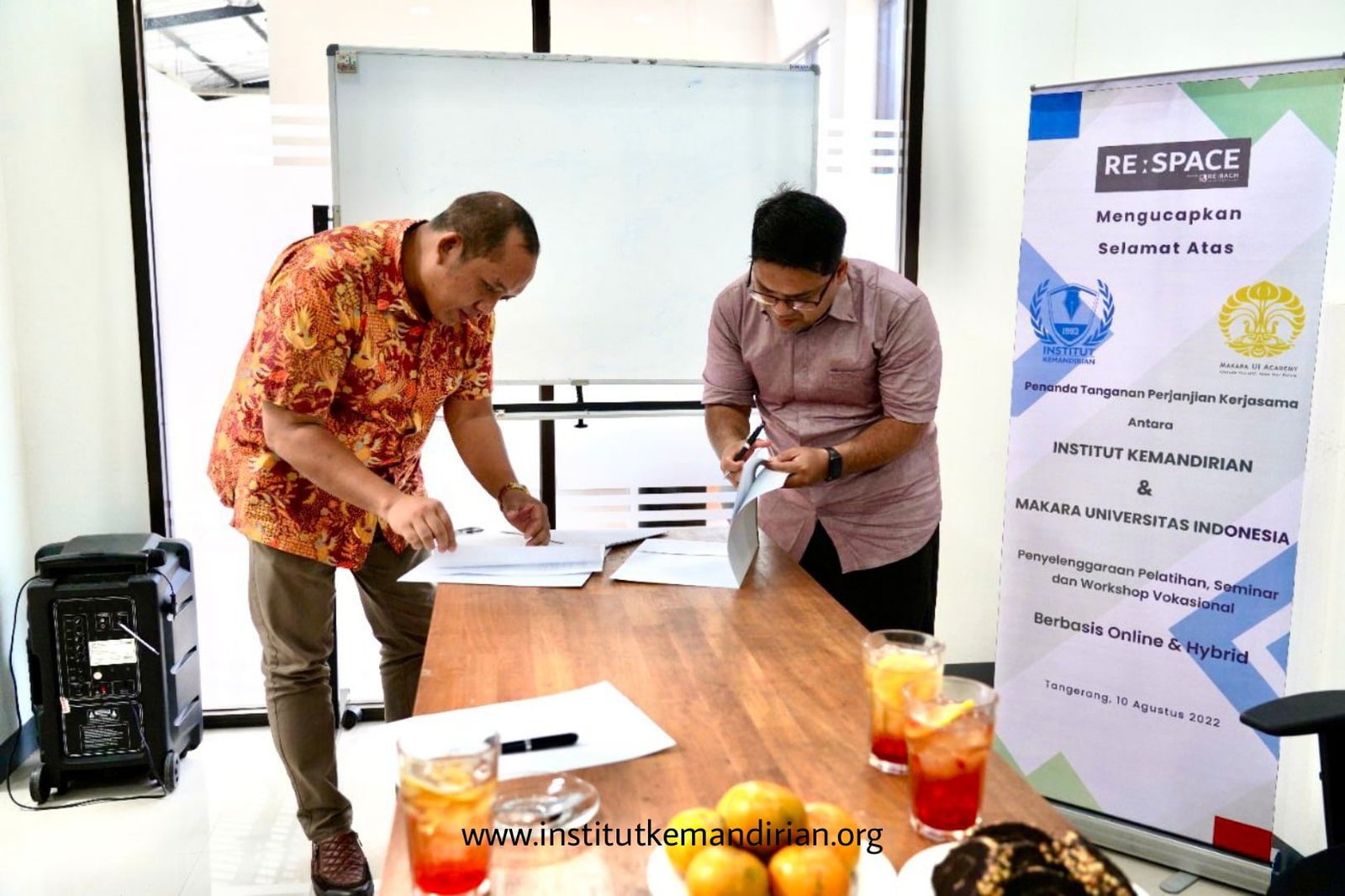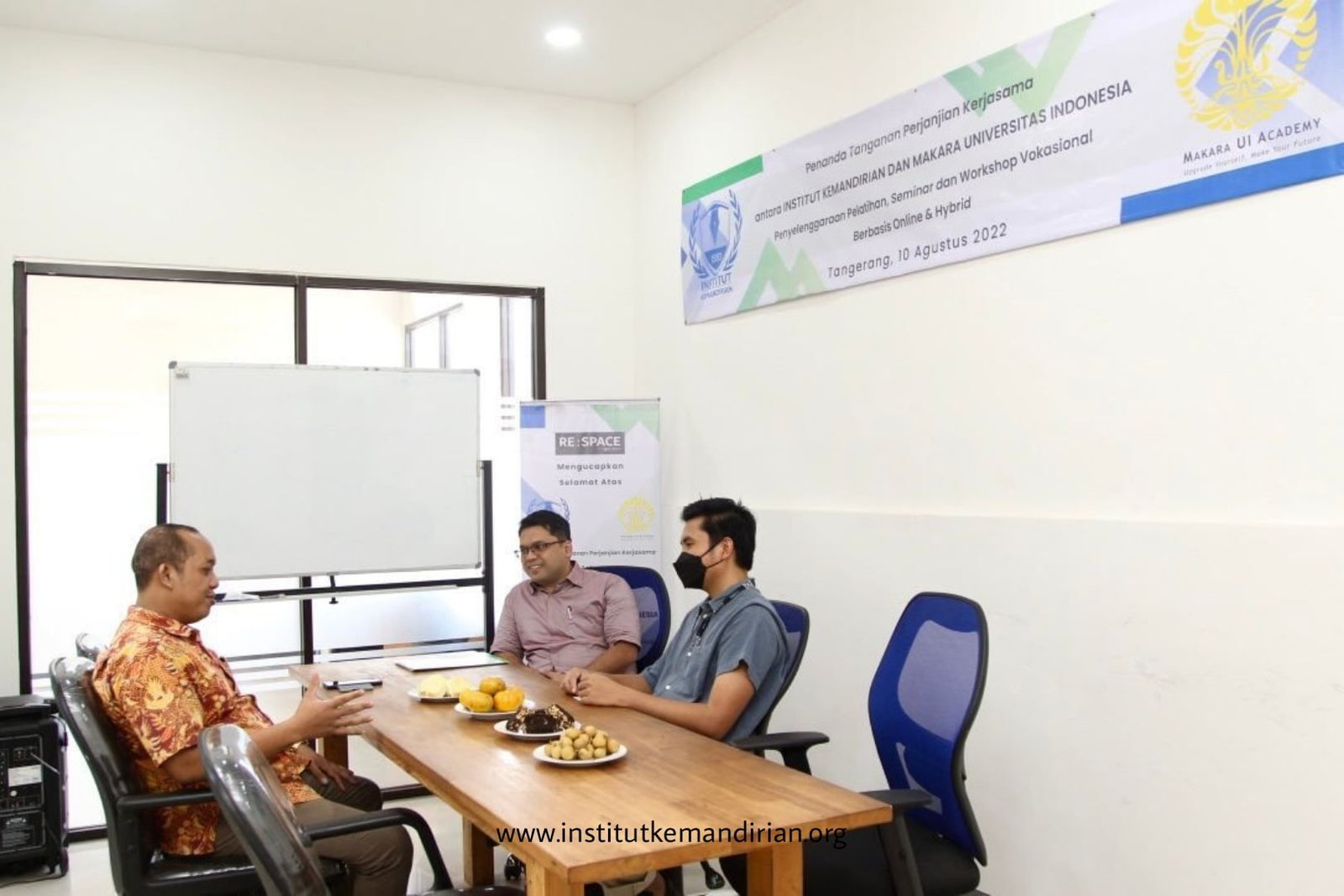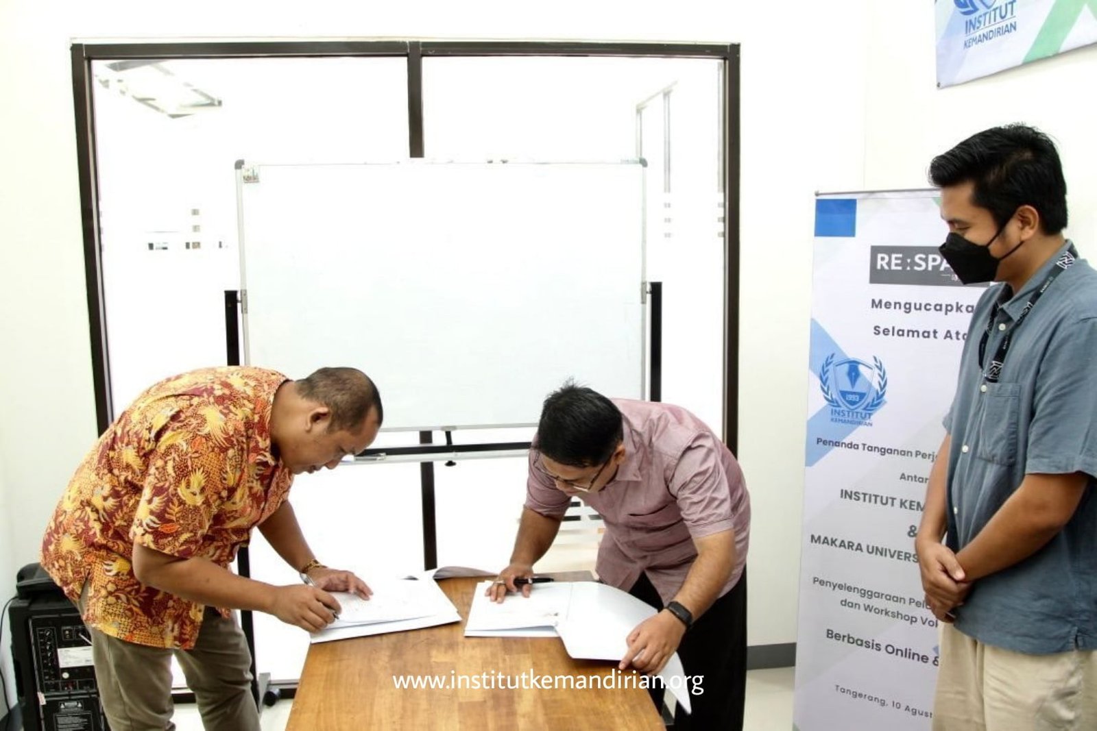 Tangerang – Institut Kemandirian melakukan penandatangan MoU dengan Makara Universitas Indonesia (UI) terkait penyelenggaraan pelatihan, seminar, dan workshop vokasional berbasis online dan hybrid. Penandatangan tersebut dihadiri oleh Direktur Institut Kemandirian Abdurrahman Usman, perwakilan dari Makara UI Joni Cahyono dan perwakilan dari PT. Rebach International, Muhammad Iqbal.